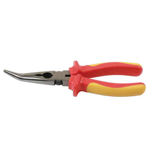 Insulated bent nose pliers, part of a wide range of insulated tools from Laser, manufactured from chrome vanadium with satin finish, with high voltage safety grip handles. VDE and IEC60900 certified.